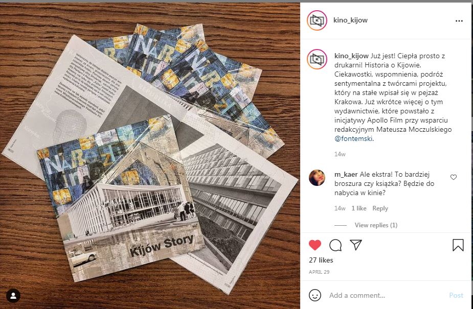 Zrealizowany – z inicjatywy i współpracy dyrekcji Kina Kijów i Apollo Film - folder z historią bardzo znanego krakowskiego kina. Miałem okazję go pisać i współredagować, a design opracował Michał Kuraś. Dodatkową atrakcją są unikatowe zdjęcia z odsłonięcia wielkoformatowego ekranu z 1967roku, autorstwa legendarnego fotografa Wojciecha Plewińskiego.
